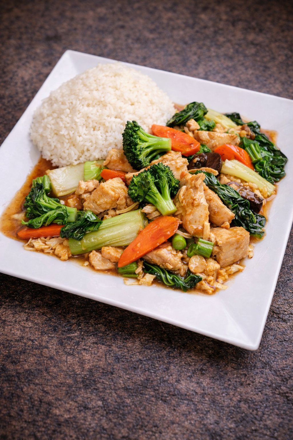 smažená rýže, zelenina, palivé a masem dle výběru ( muzete ne palive)