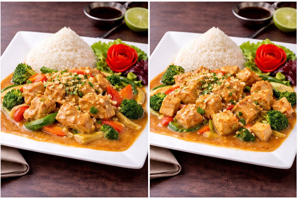 omacka metana.kokos houby, zelenina, pálivá červená kari omáčka,s ryze křupavé maso a masem dle výběru