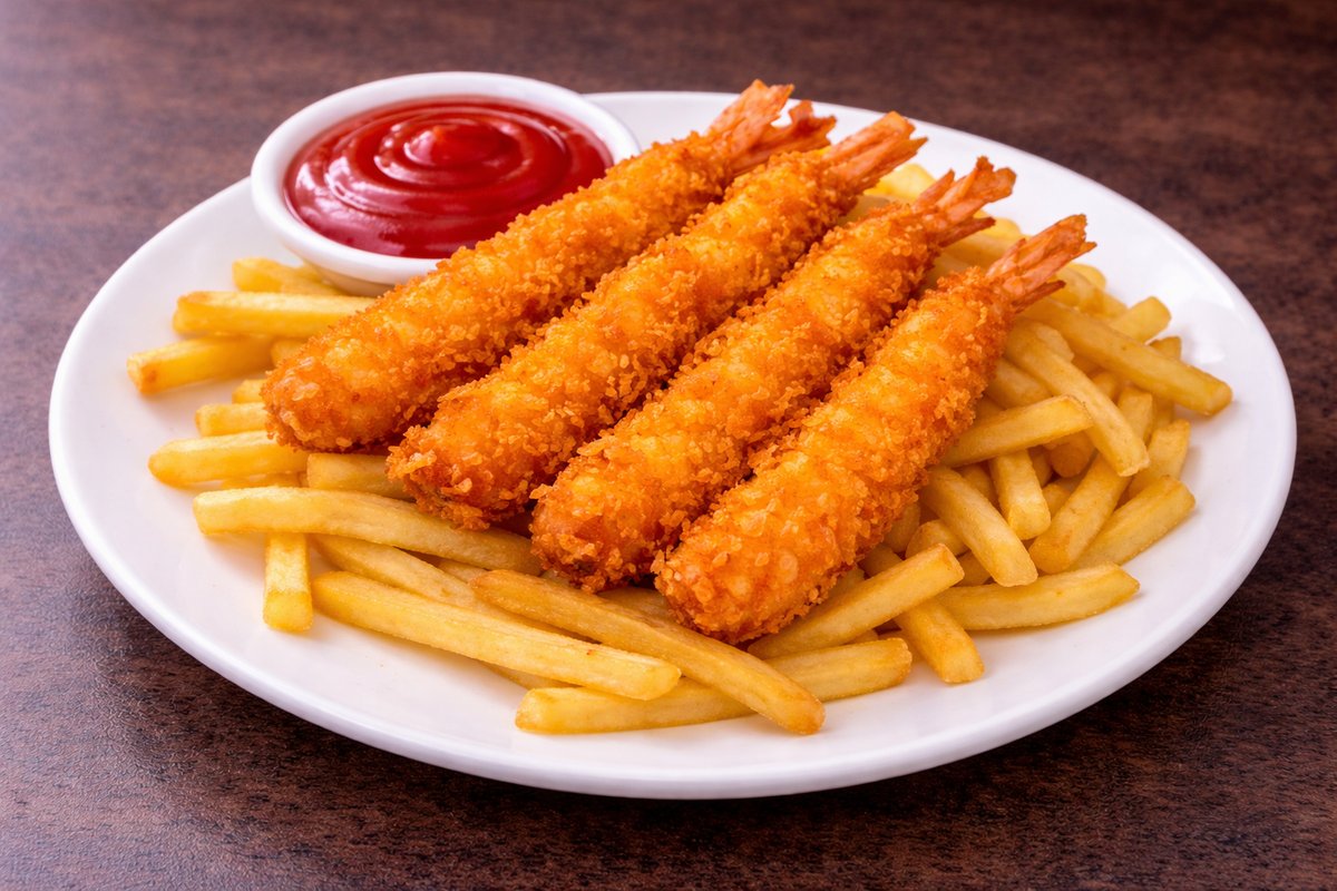 Smažené hranoky s krevety tempura, podávané s kečupem nebo tatarskou omáčkou