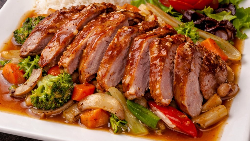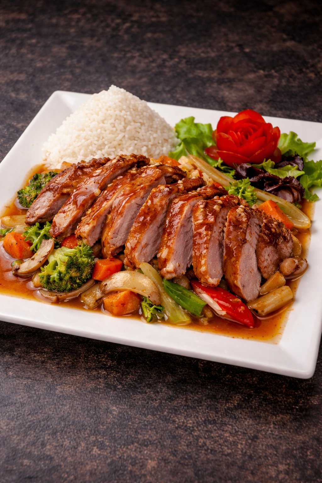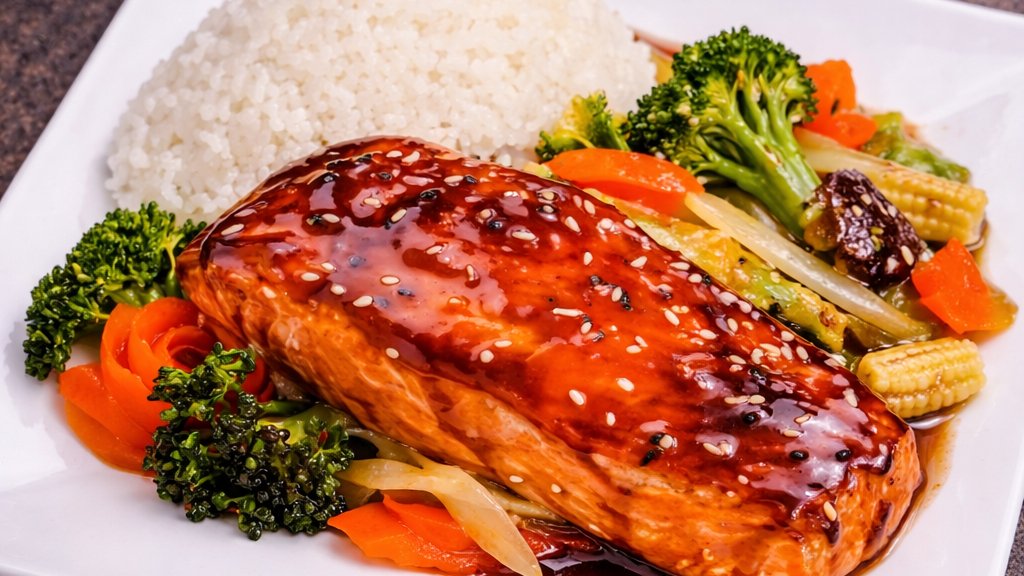 Losos s teriyaki omáčkou se zeleninou a rýží