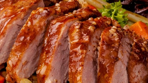 grilované vepřové maso, rýžové nudle, salát, koriandr a sladkokyselá omáčka