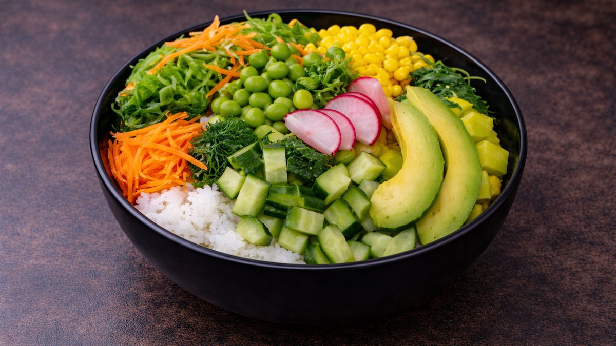 Rýžové nudle s tofu, Mini závitky, Salát s bylinkami a zálivkou