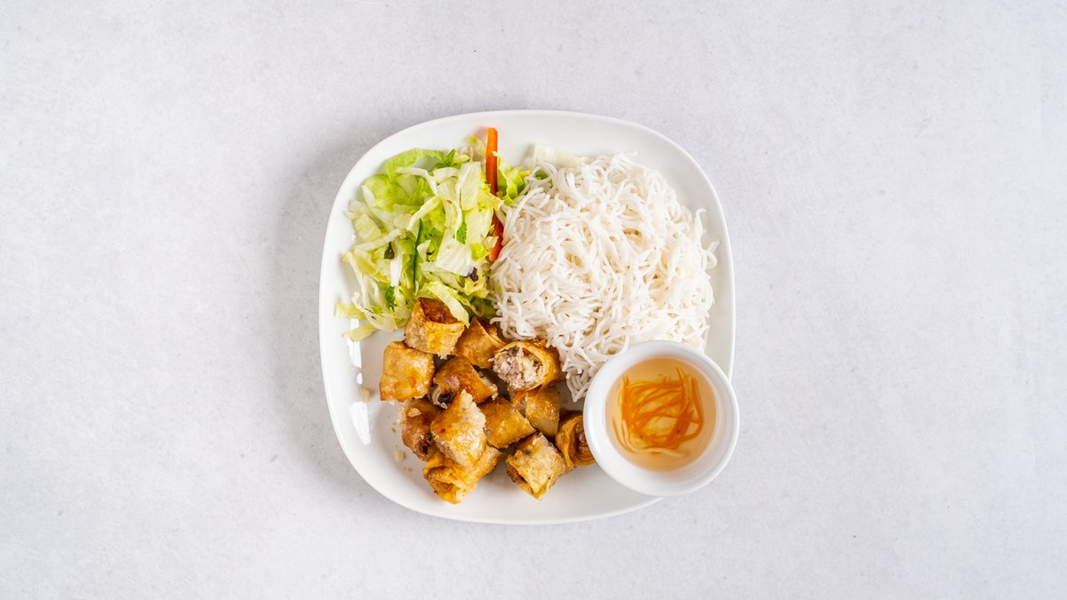 smažené jarní závitky, rýžové nudle, sójové klíčky, okurka, mrkev, sezam, sezónní bylinky, rybí sladkokyselá omáčka