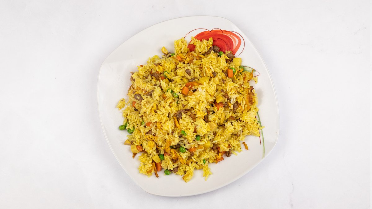 smažená rýže z woku s masem, kukuřice, karotka, zelený hrášek, cibule, vejce