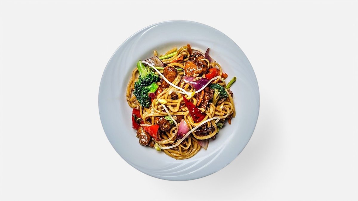 smažené udon nudle, červené kari, maso, brokolice, mrkev, cuketa, cibule, paprika a smažená cibule