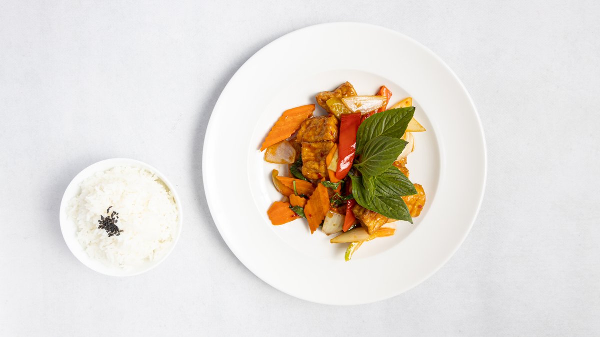 restované maso, červená paprika, cuketa, bambus, cibule, krachai koření s thajskou bazalkou a červenou kari pastou, s rýží