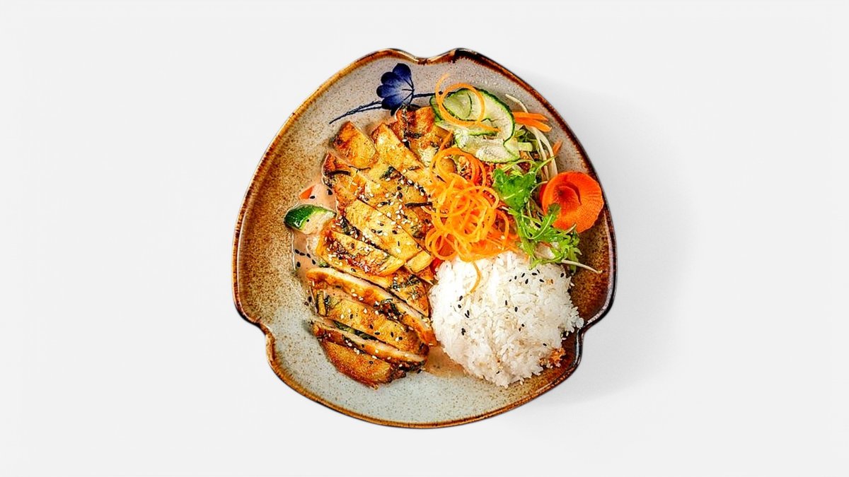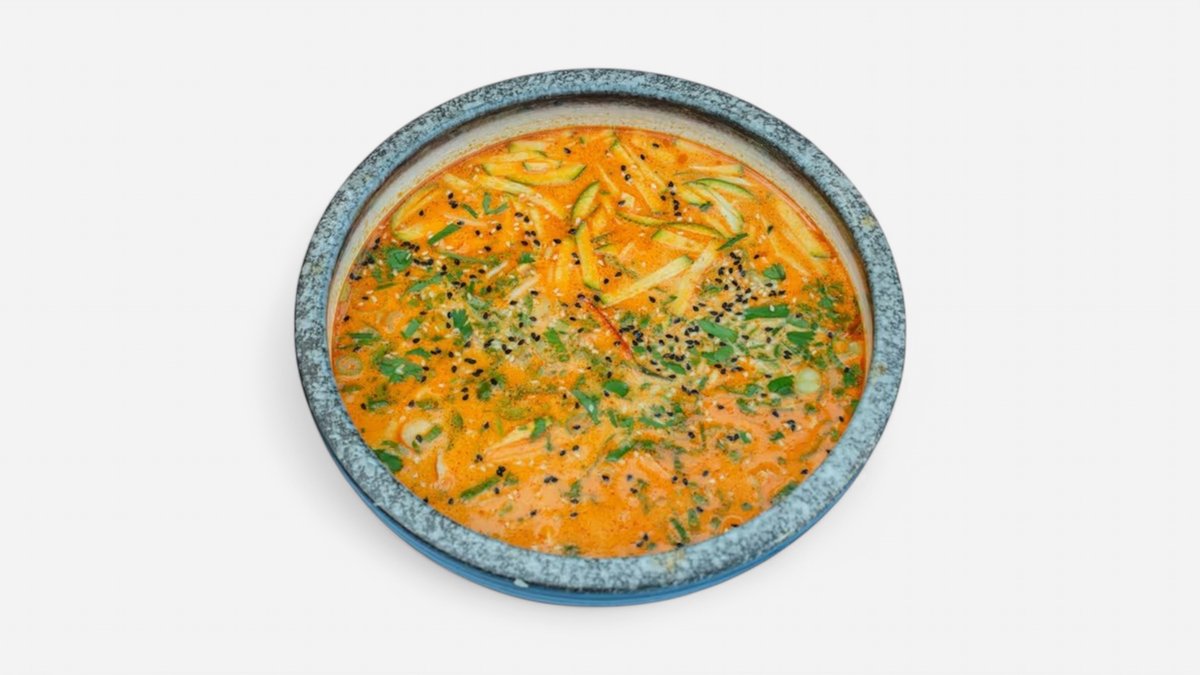 silný vývar s kokosovým mlékem, tofu, červené kari, sójové klíčky, cibulka, koriandr a rýžové nudle