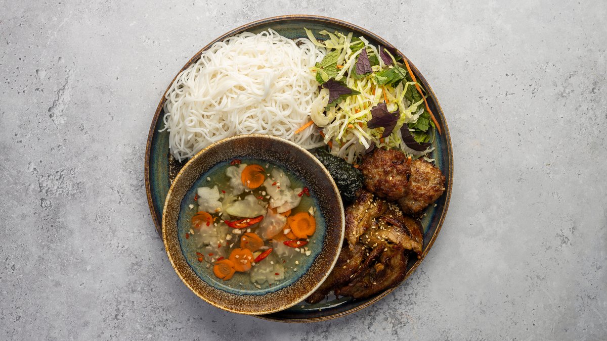 Rice noodles with grilled pork, salad, Vietnamese herbs and fish sauce