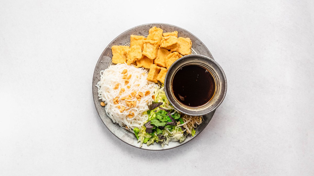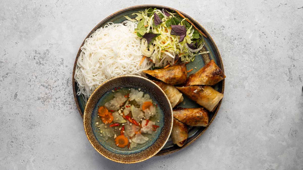 Rice noodles with spring rolls or vegan rolls, fried onions, vegetables and fish sauce