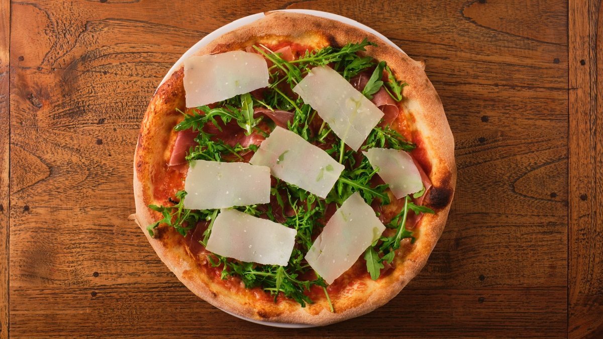 rajčata san marzano, mozzarella, prosciutto crudo S.D., rucola, grana padano