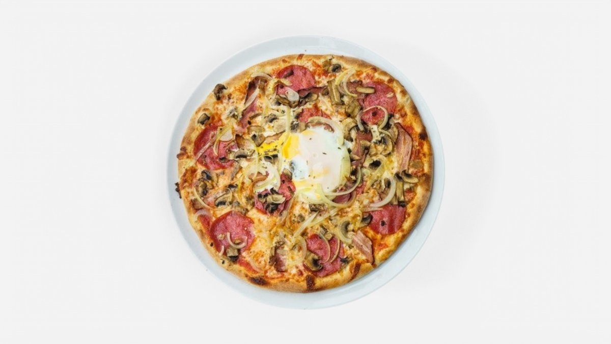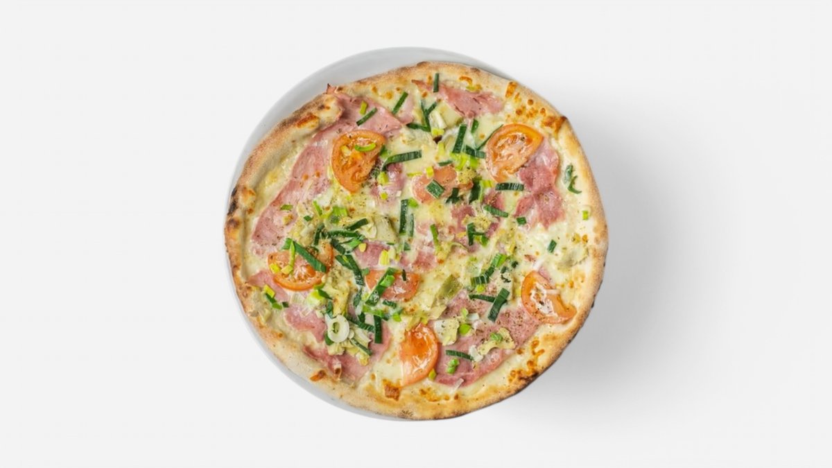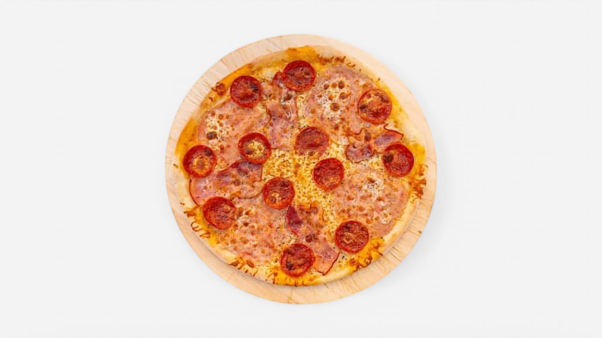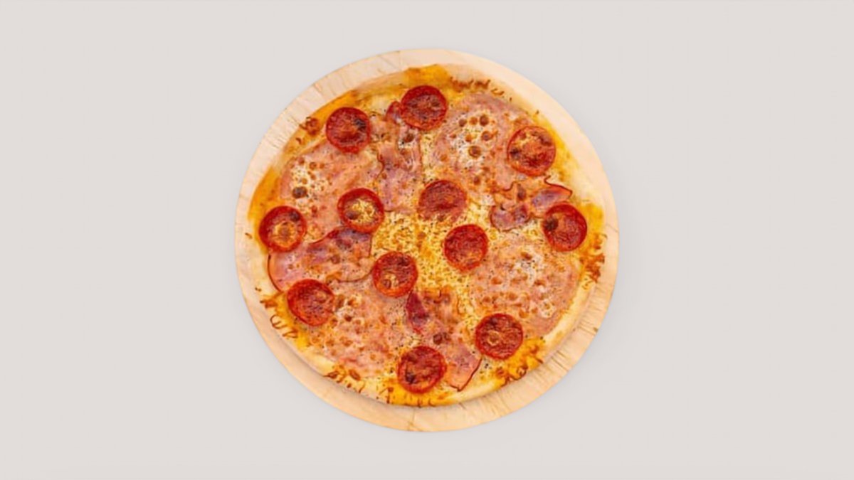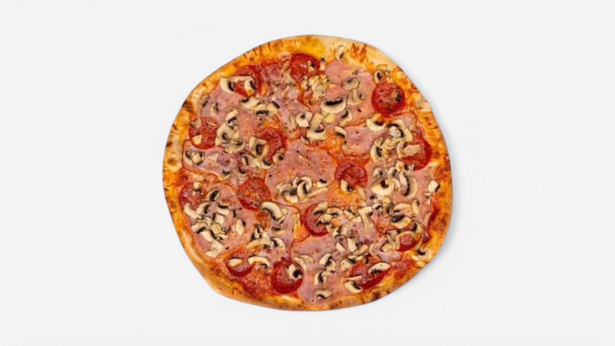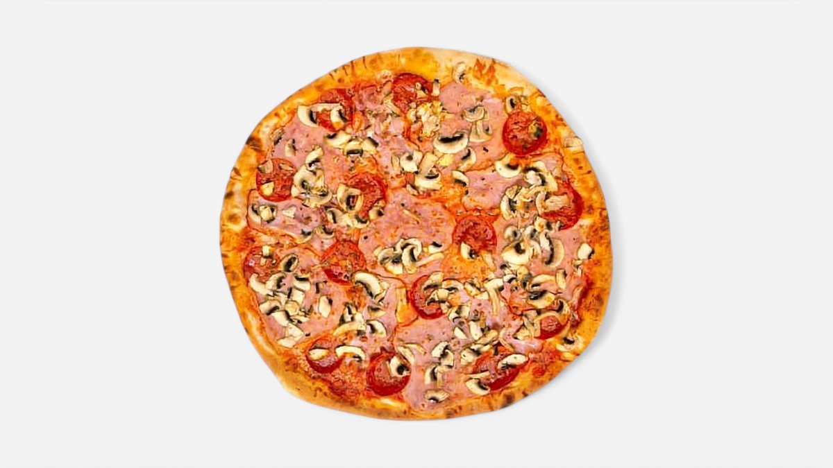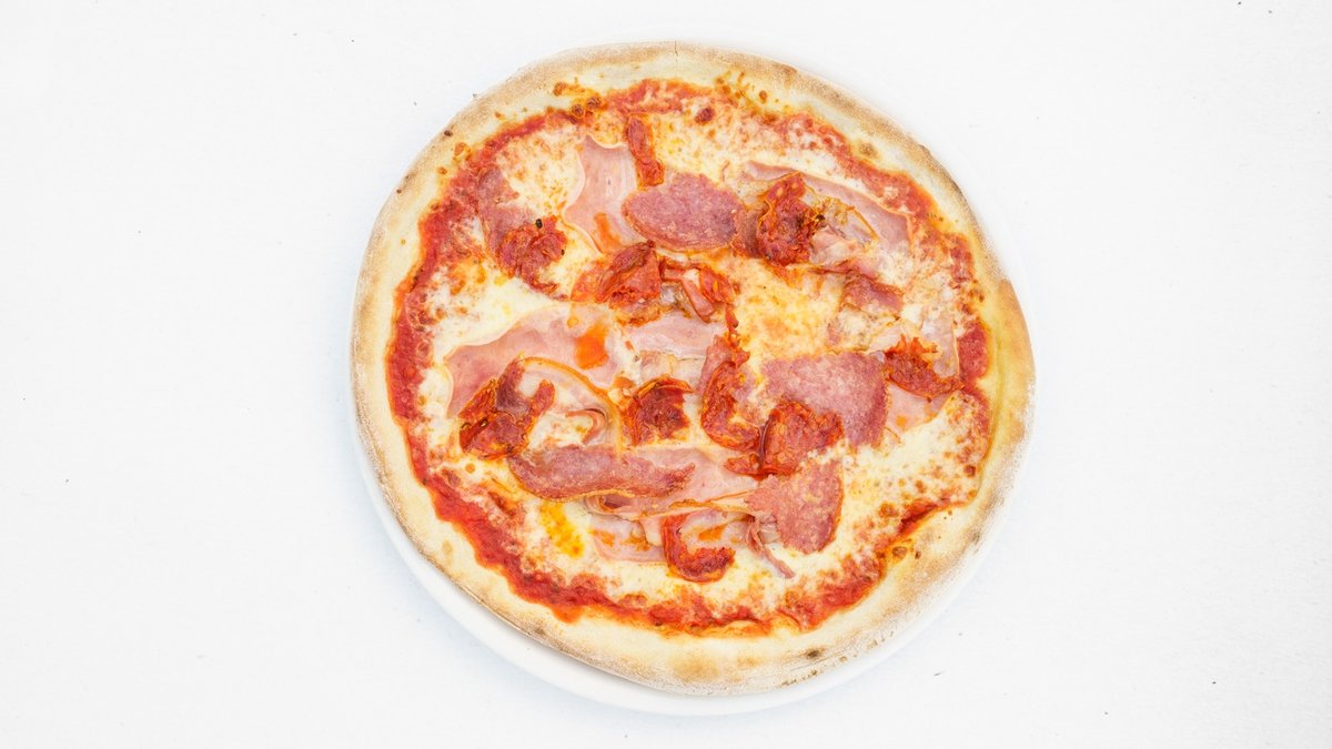Tomato, mozzarella, dušená šunka, anglická slanina, pikantní salám, žampiony