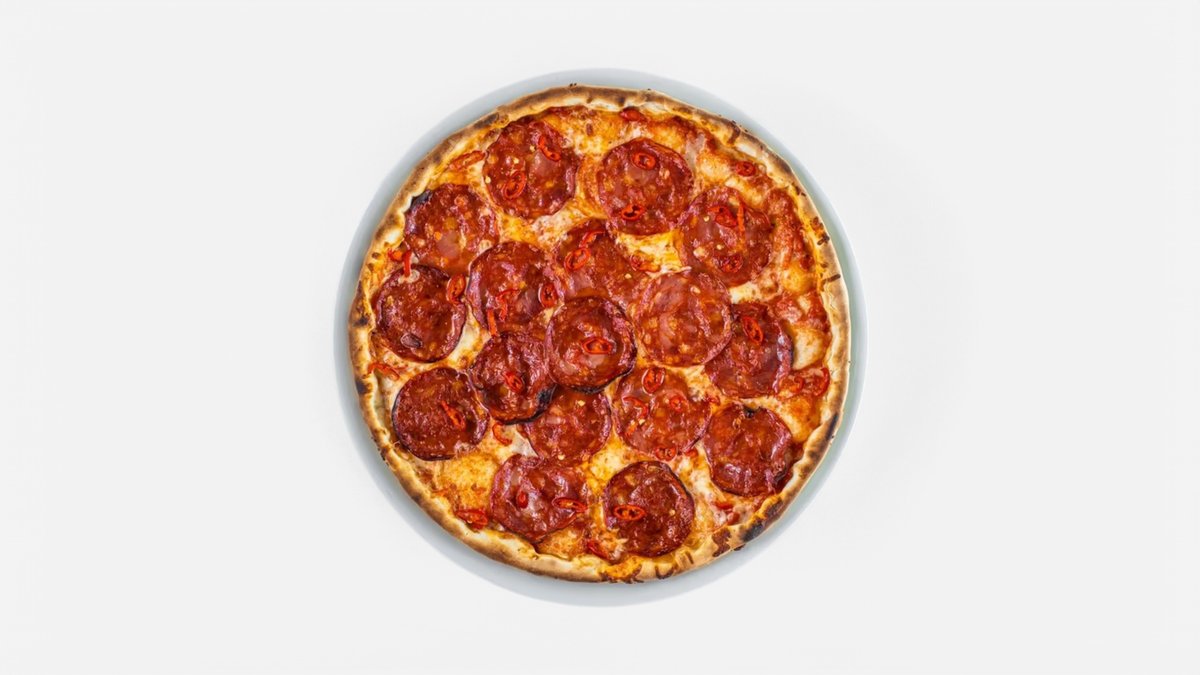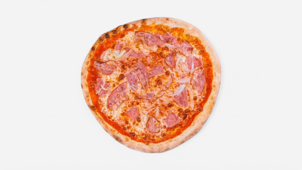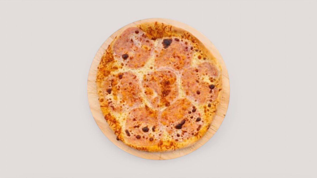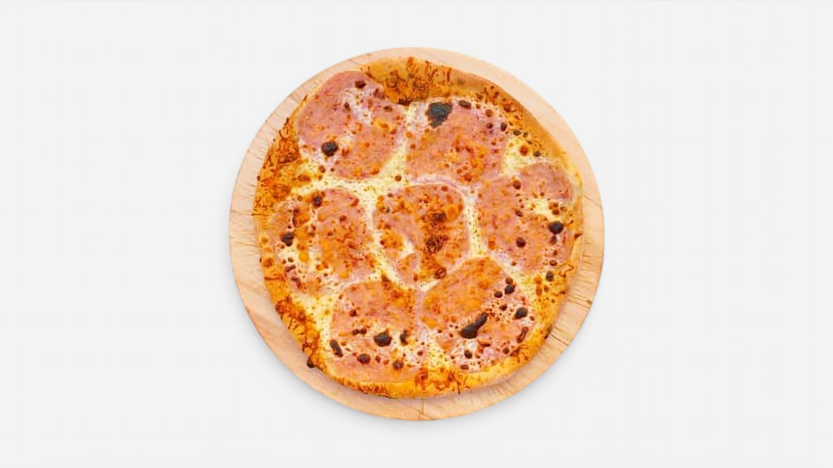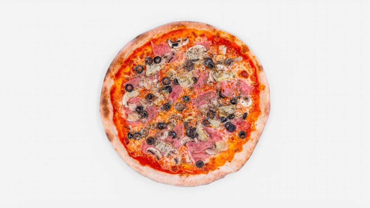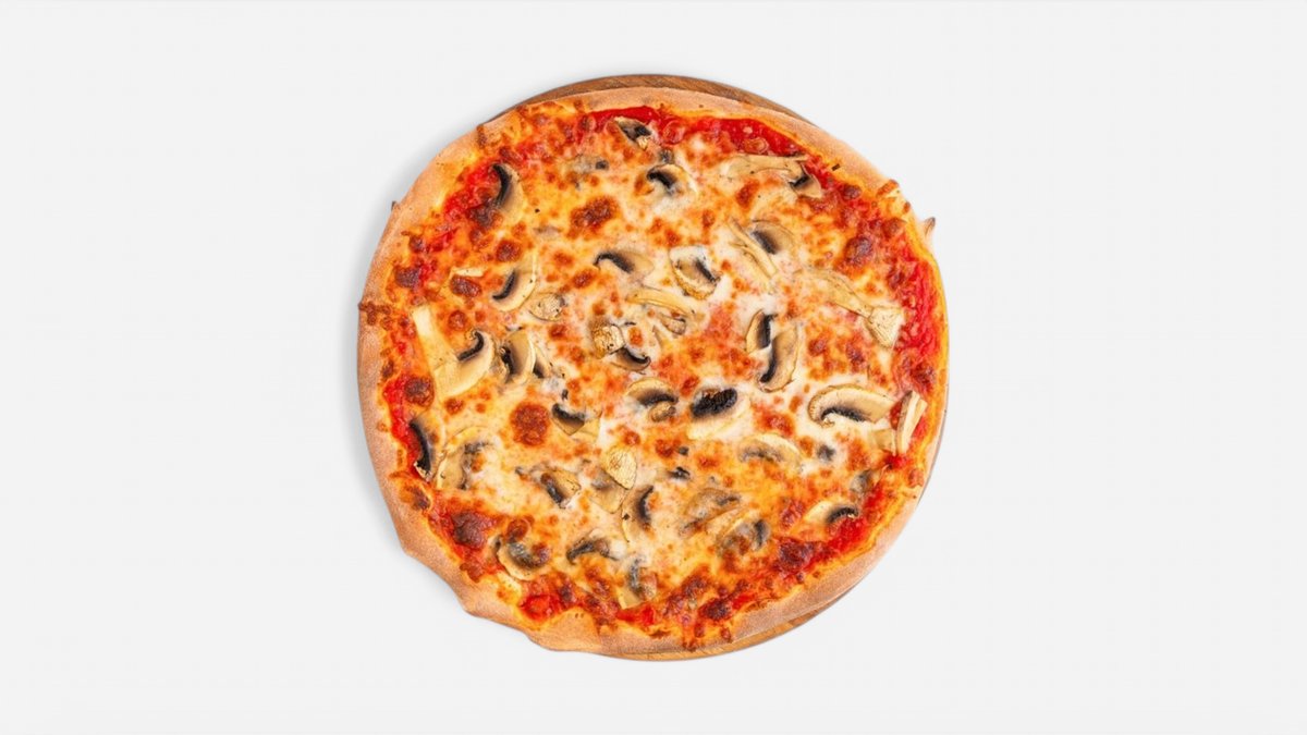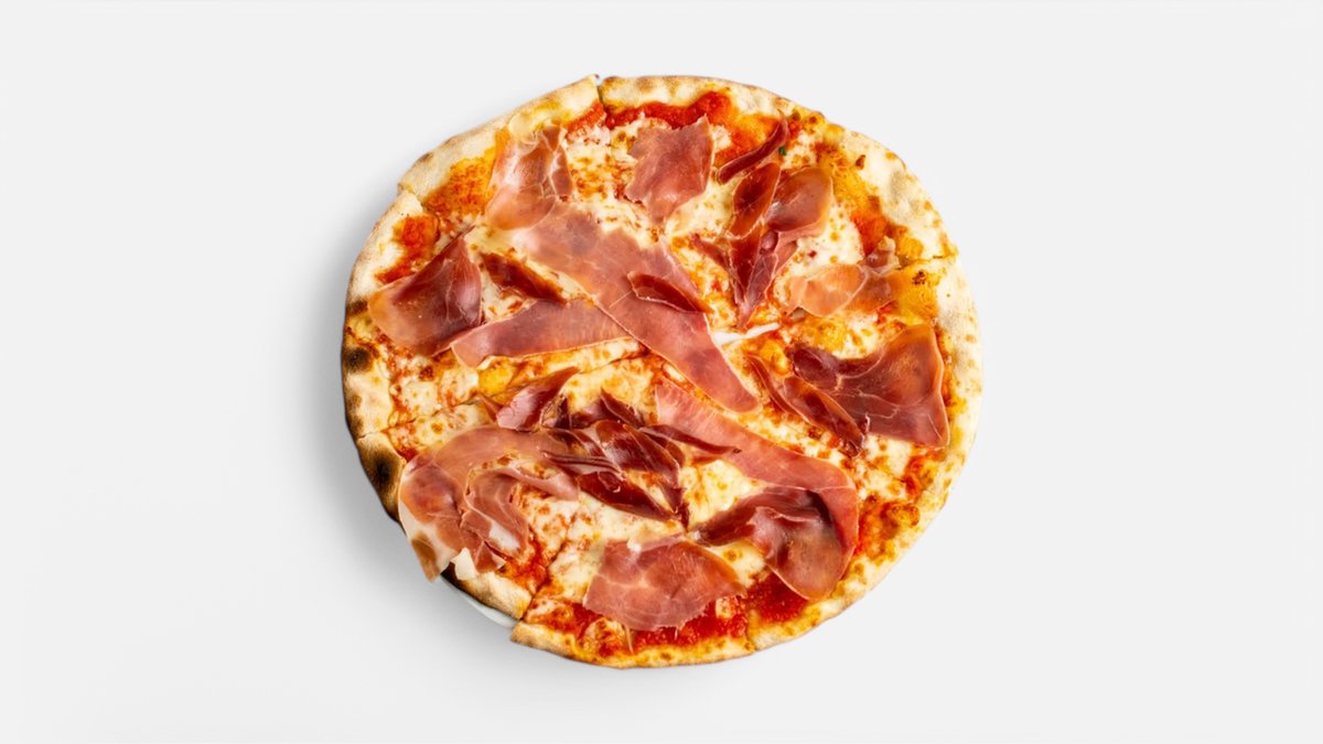Tomato, mozzarella, dušená šunka, anglická slanina, pikantní salám, žampiony