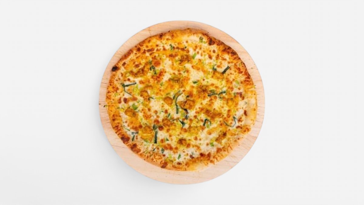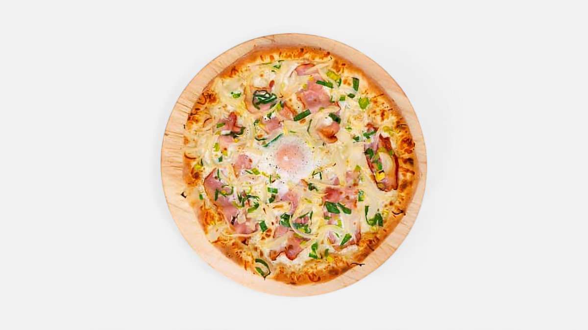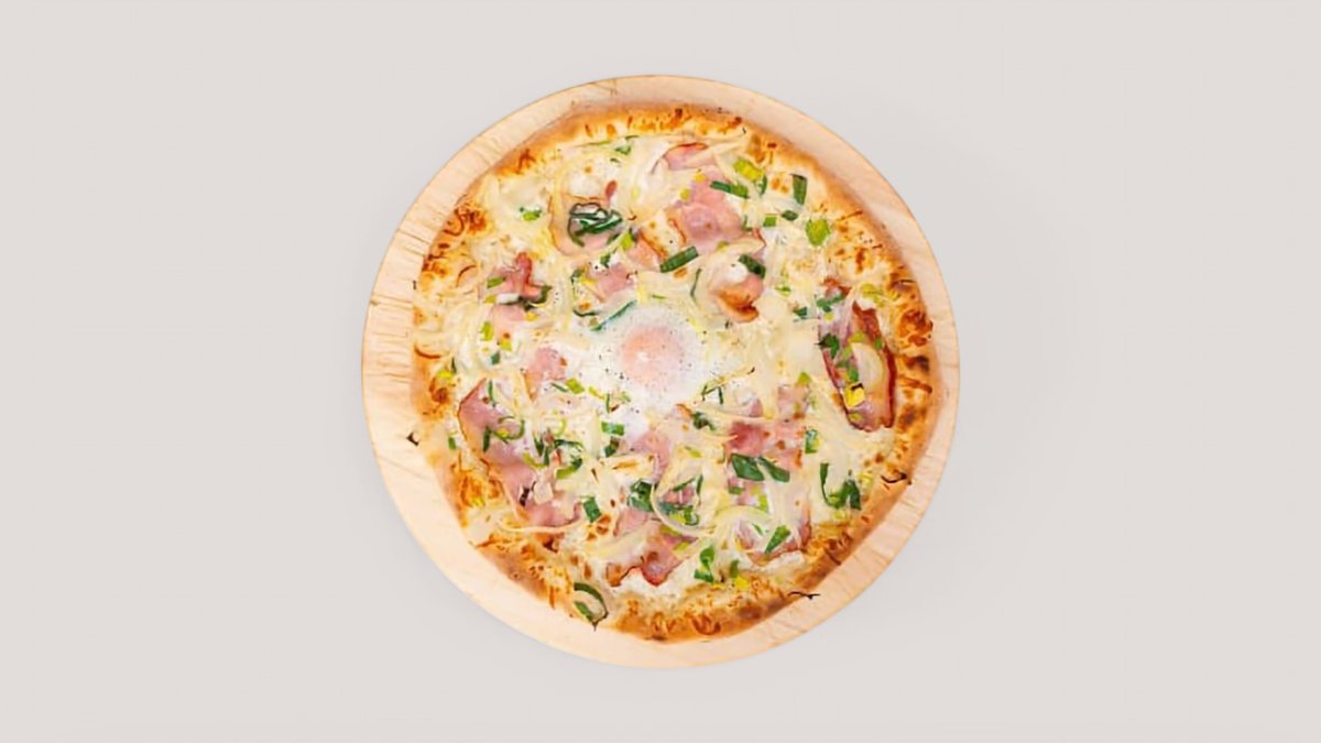 Smetana, mozzarella, anglická slanina, cibule, pórek, vejce