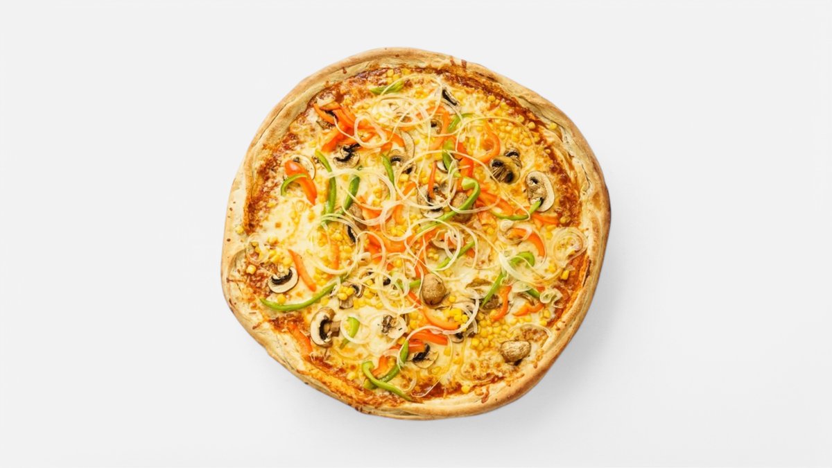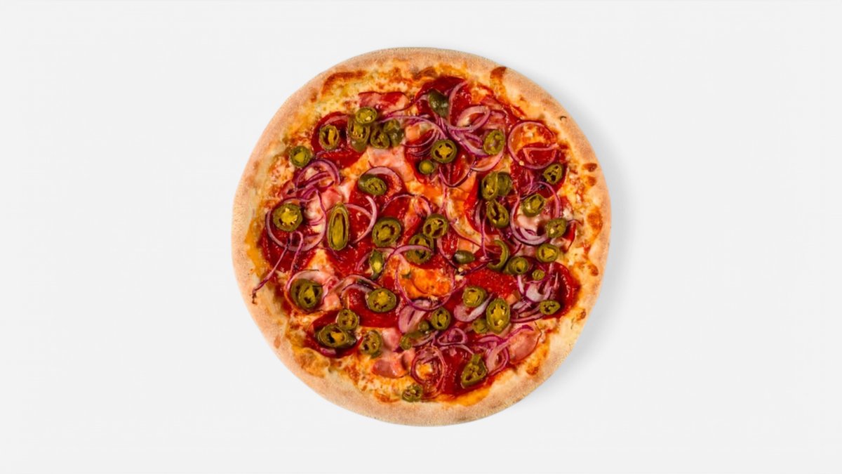 tomato, mozzarella, anglická slanina, feferonky, cibule, fazollky