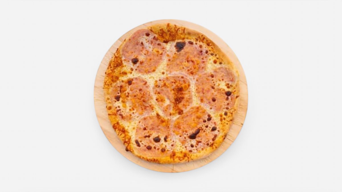smetana, mozzarella, anglická slanina, dušená šunka, pikantní salám, pepř