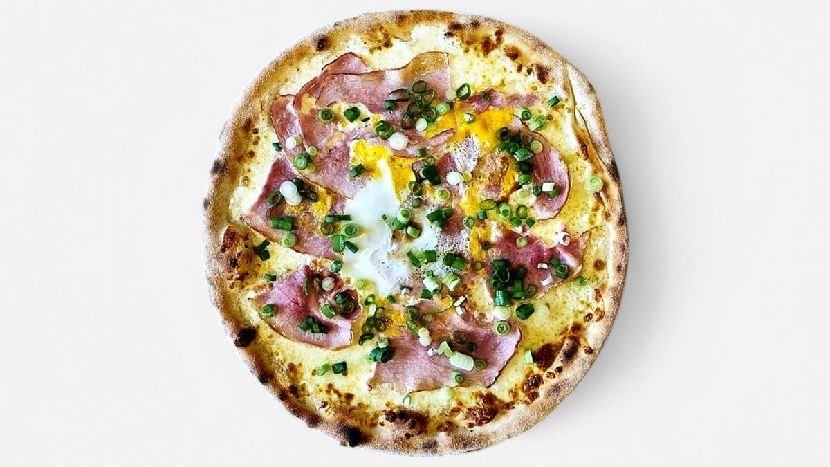 smetana, mozzarella, šunka od kosti, vejce, jarní cibulka + česneková omáčka