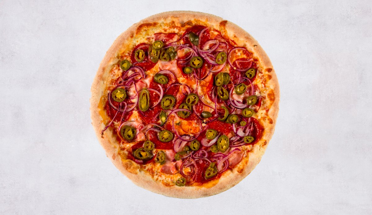 tomato, sýr, pikantní salám, olivy, feferonky, cibule