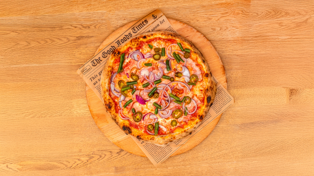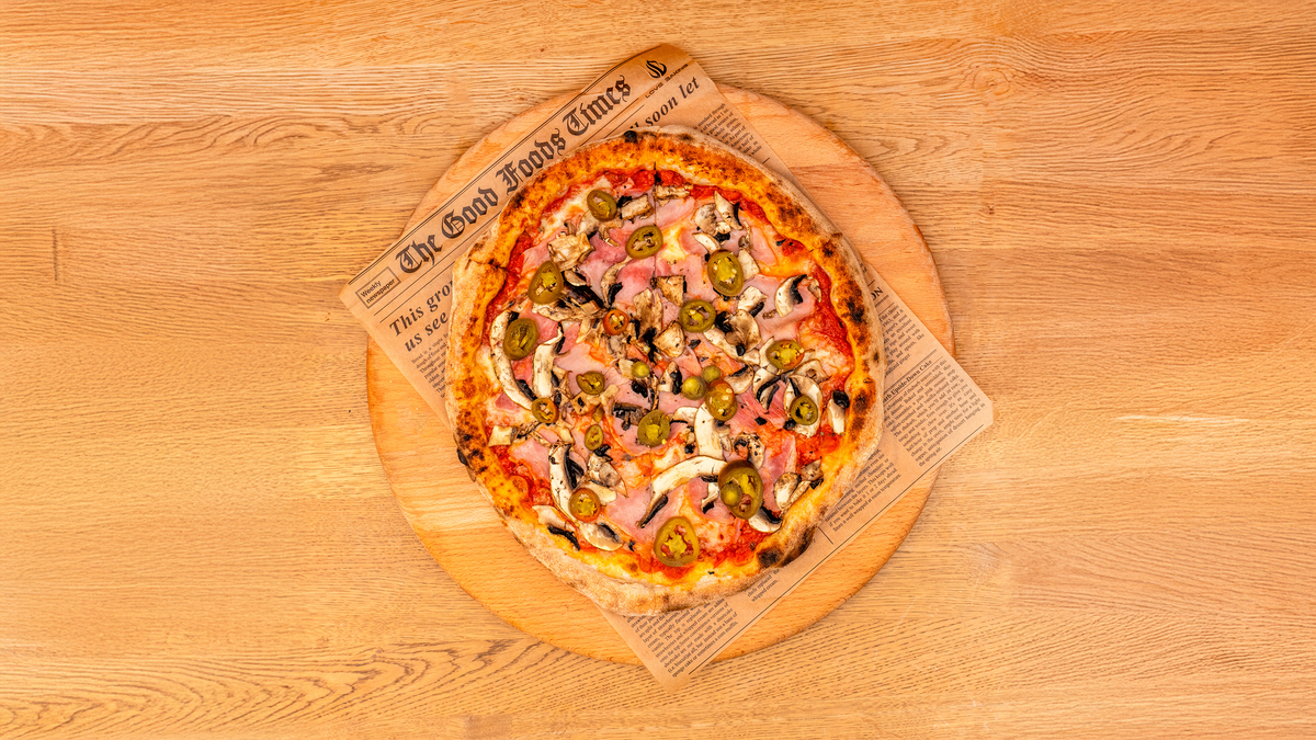 tomato, mozzarella, šunka od kosti, žampiony, jalapenos