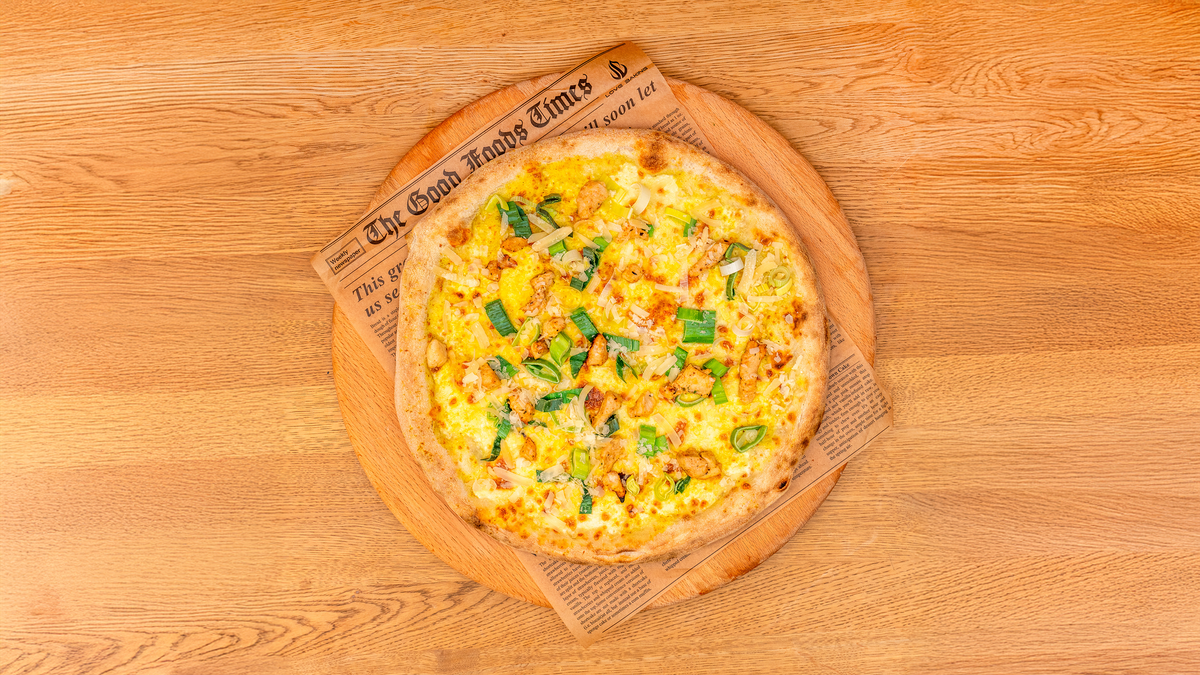 smetana, mozzarella, kuřecí maso, kari, pórek, parmezán