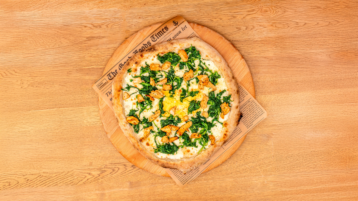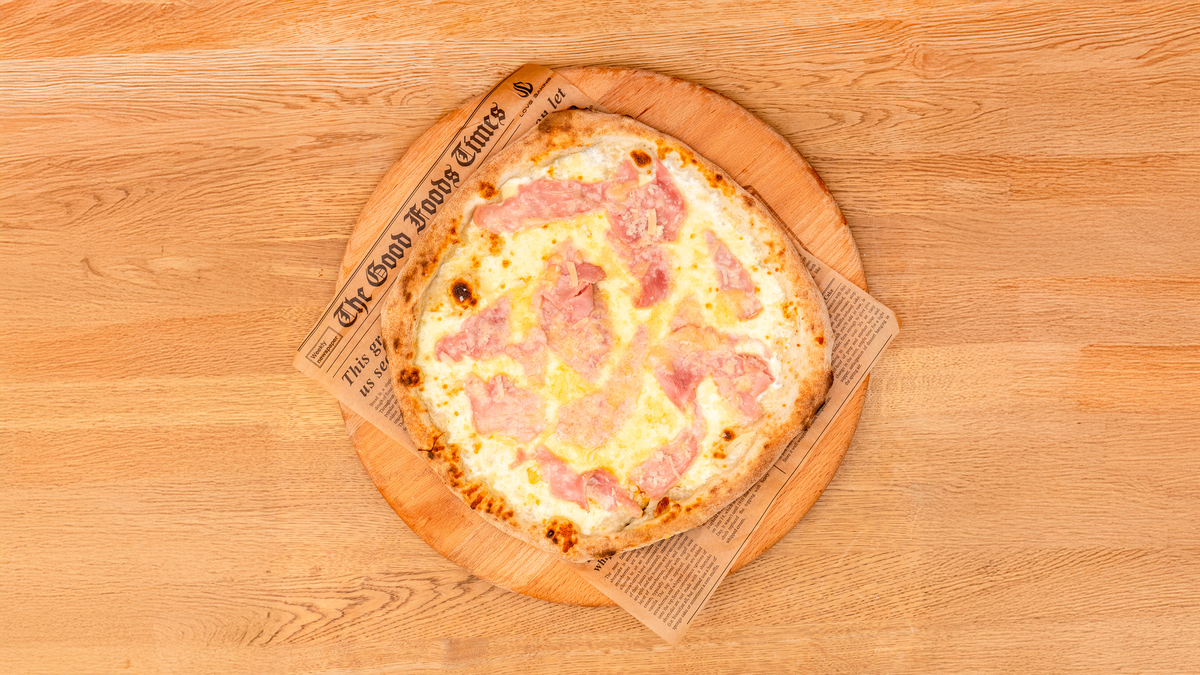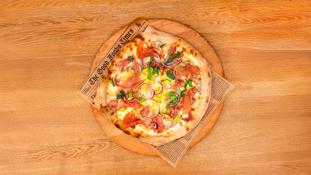 smetana, mozzarella, anglická slanina, cibule, pórek, parmská šunka, vejce
