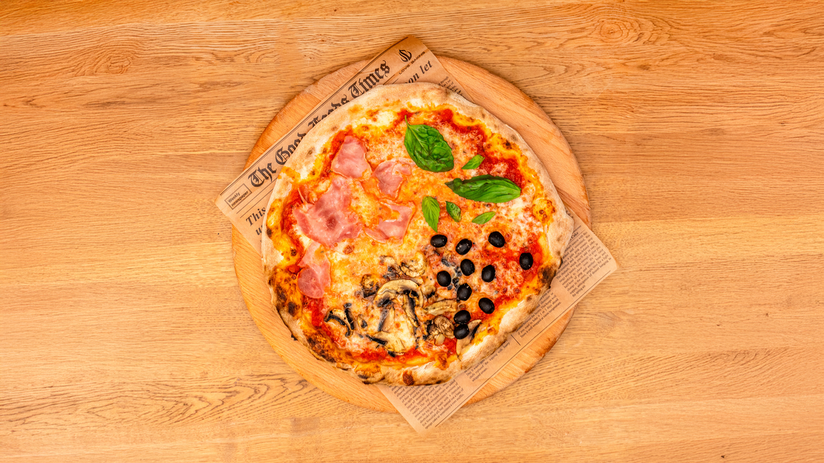 tomato, mozzarella, šunka od kosti, žampiony, olivy