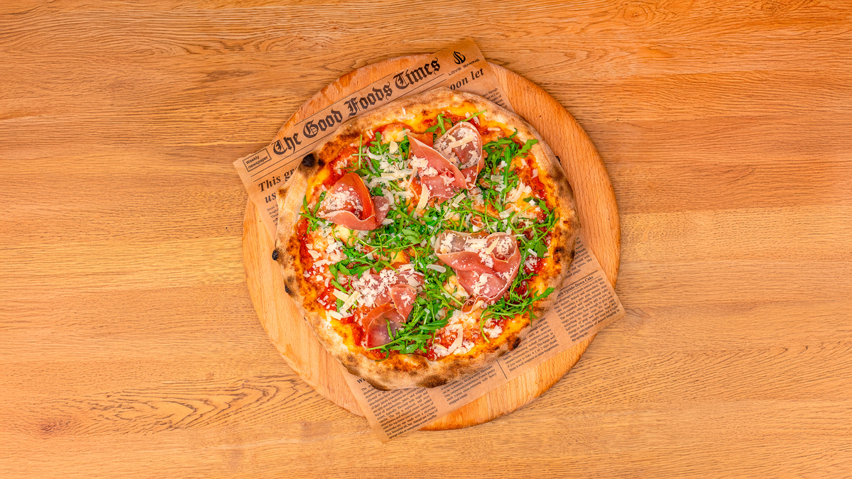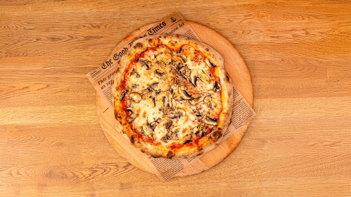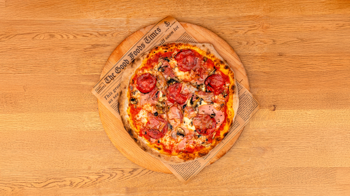tomato, mozzarella, šunka od kosti, čorizo, anglická slanina, žampiony