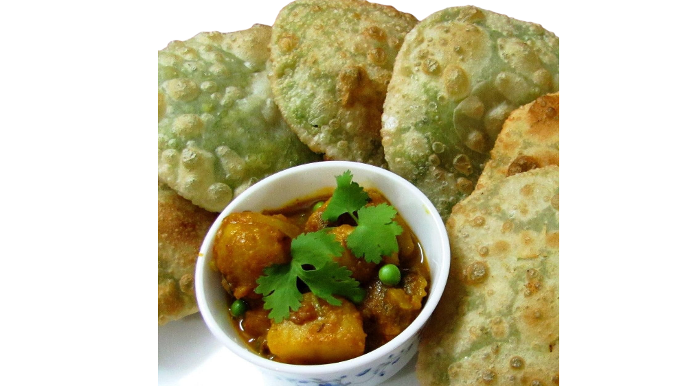 Lightly spiced whole-wheat breads with green peas, served with a classic Indian potato curry simmered in a tomato, onion, and spice sauce