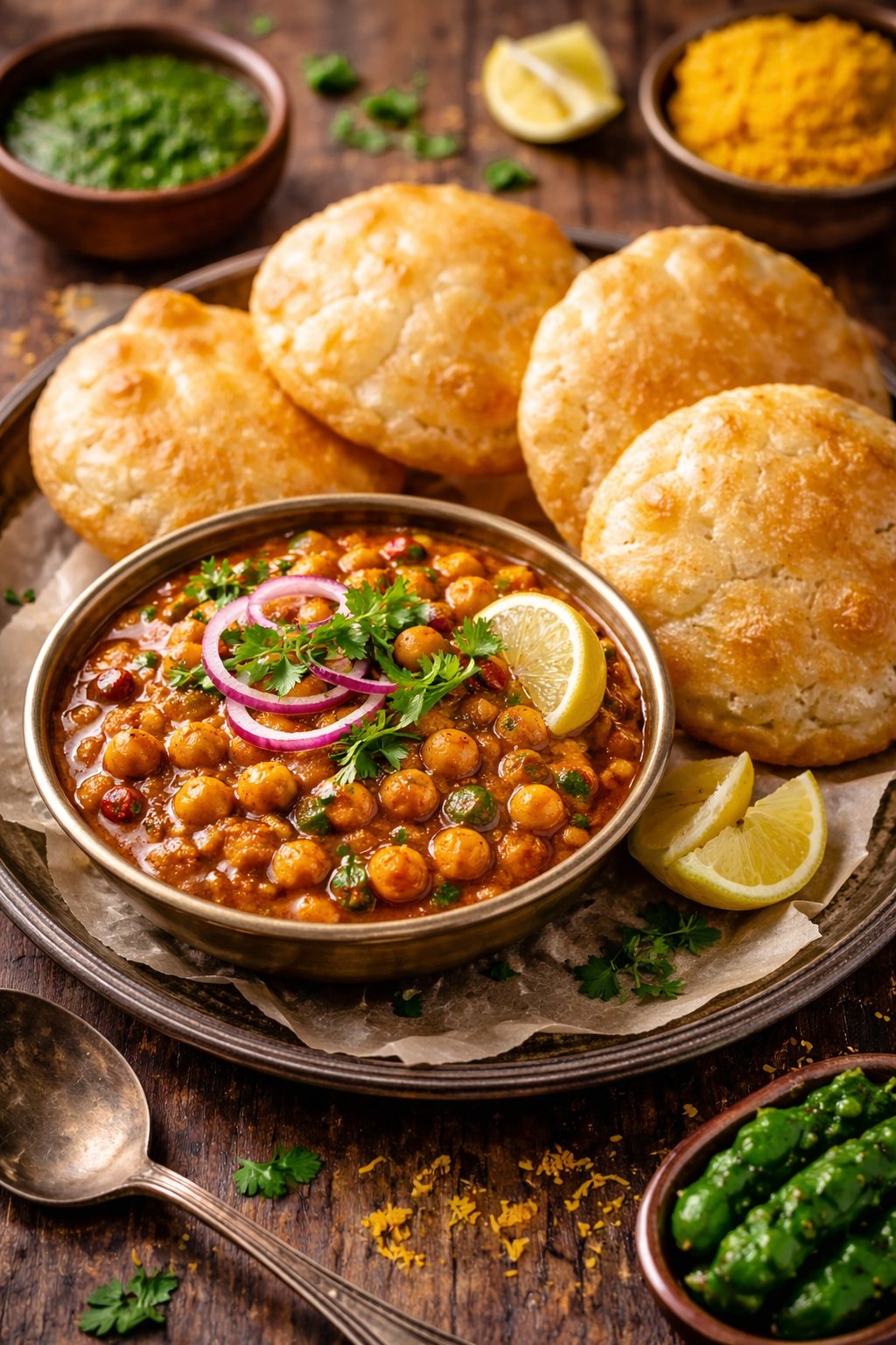 Chickpeas in a spiced tomato-onion gravy with fluffy, deep-fried whole wheat bread