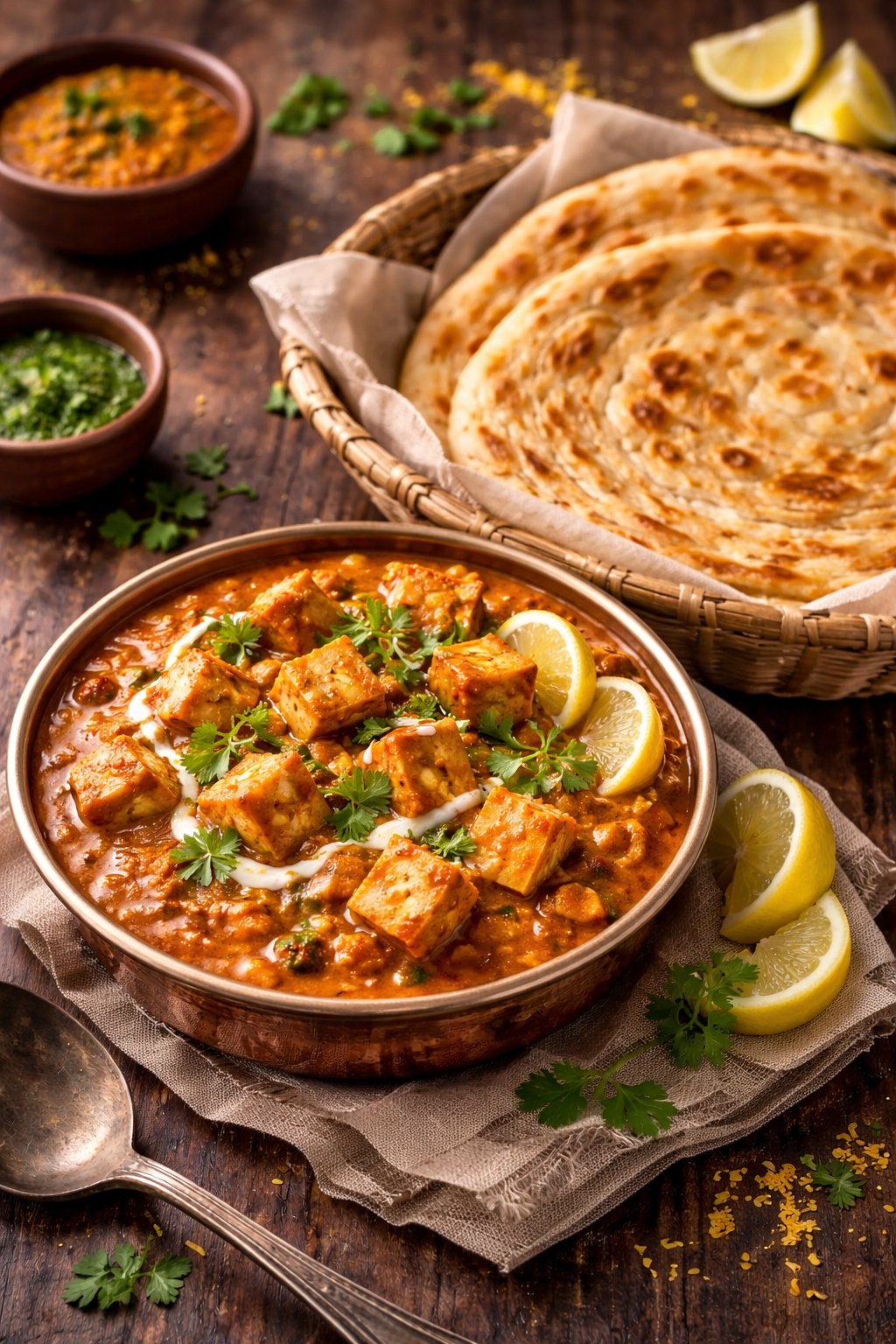 Crispy Tofu marinated in creamy gravy with Indian spices and served with two flat bread
