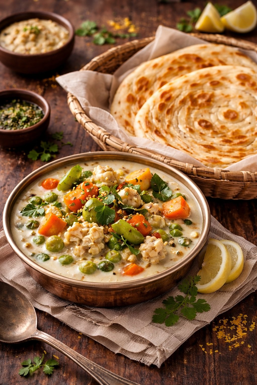 A silky coconut vegetable stew infused with curry leaves and whole spices. Served with flaky paratha. (1)