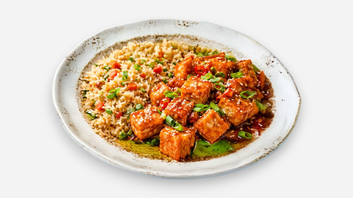 Crisp tofu cubes tossed in a sweet and spicy Indo-Chinese sauce with honey, soy, garlic, ginger, and fresh chilies, served alongside fragrant stir-fried rice with vegetables