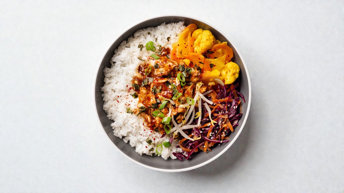 Sushi rýže, pikantní kuřecí prsa, nakládaná zelenina (květák, mrkev, bílá ředkev, sladko-kyselý dressing), zelný salátek (červené zelí, mrkev, sezamový dressing), mungo výhonky, jarní cibulka, vločky z fasy rohlí, chili prach, spicy korean omáčka.