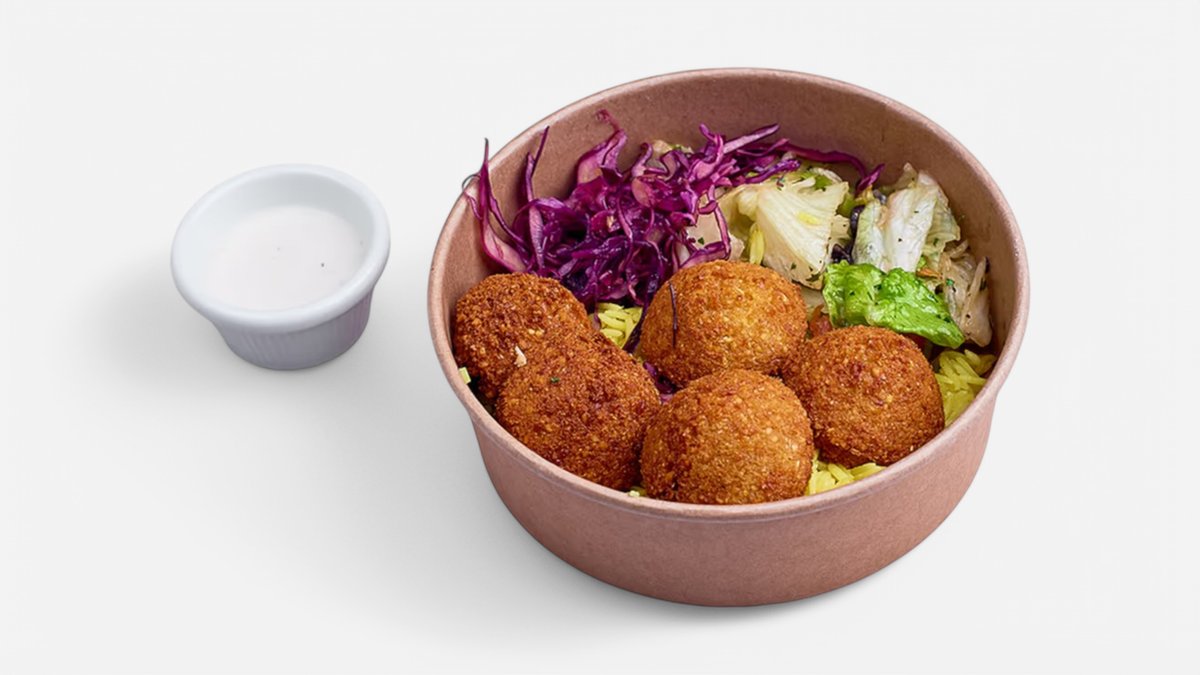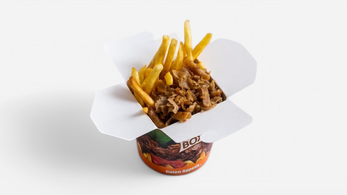Maso, salát, dresing, turecký chleba, hranolky nebo rýže