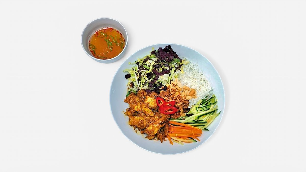 rýžové nudle s hovězím masem se zeleninou, salát, mungo klíčky, smažená cibulka, mrkev, okurka, koriandr, arašídy