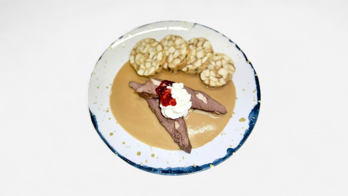 Špikovaná hovězí pečeně, svíčková na smetaně, brusinky, šlehačka, domácí žemlový knedlík 180g