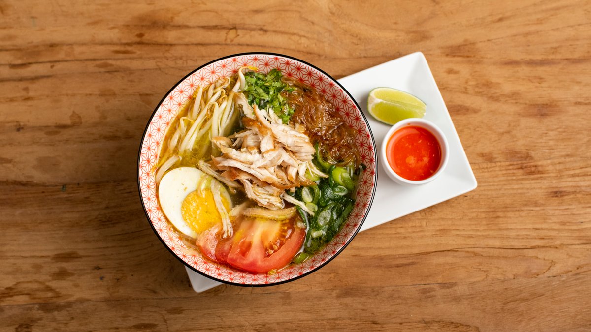 kuřecí, kokosové mléko, skleněné nudle, kurkuma, vejce, rajčata, sušená cibule, koriandr, jarní cibulka