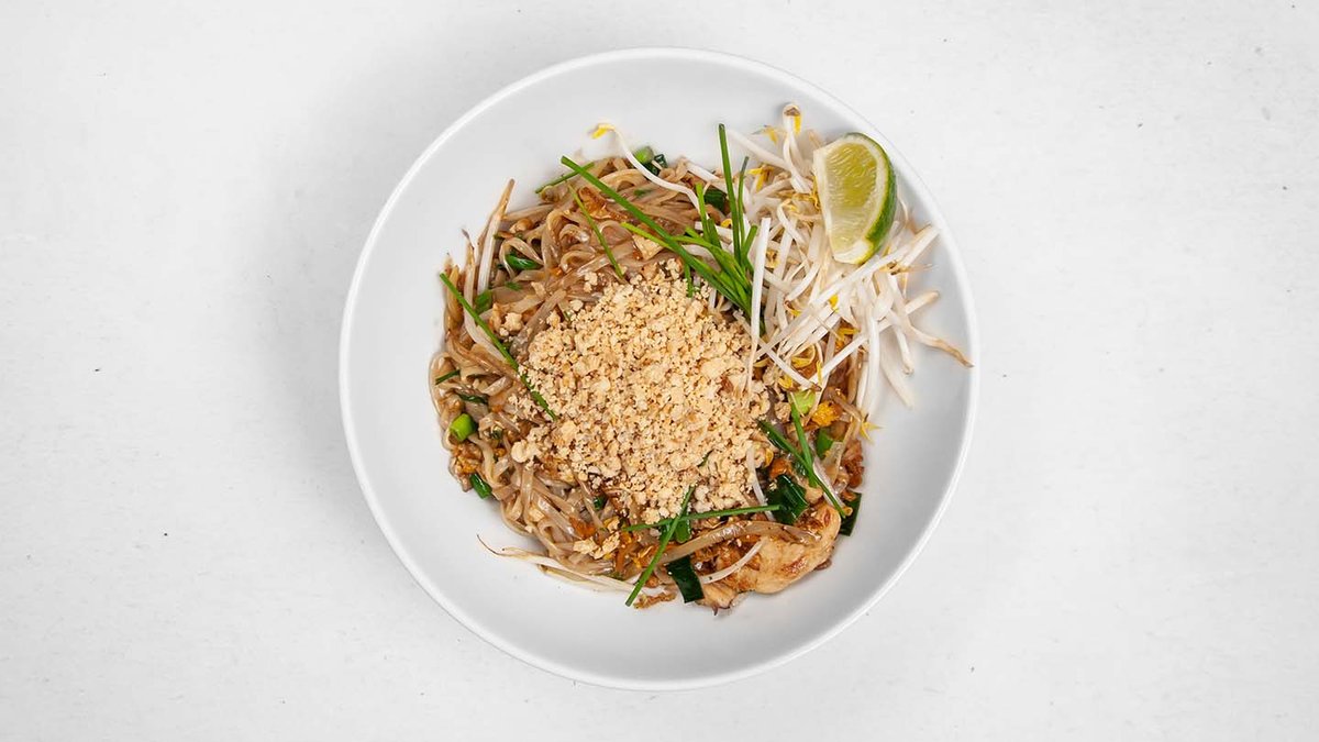 rýžové nudle, pórek, mrkev, sojové klíčky, vejce, koriandr, sušené chilli, arašídy, limetka