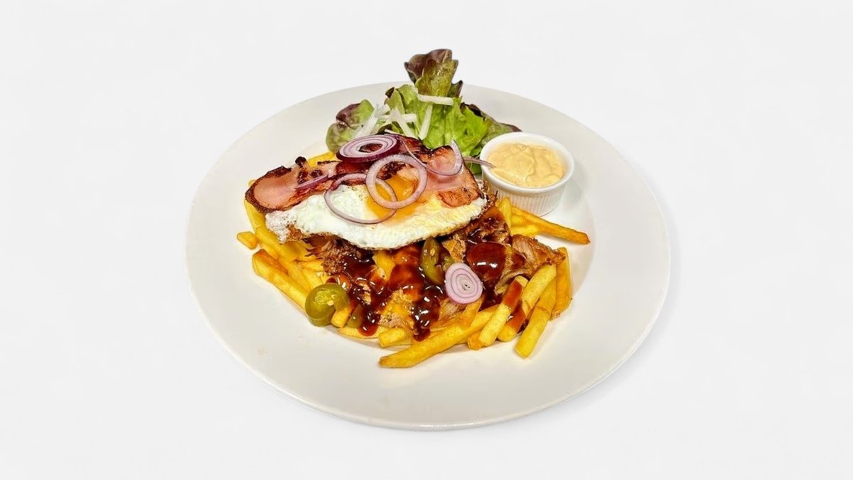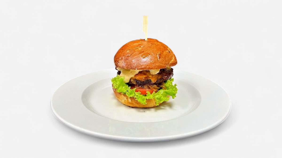 grilovaný burger z mletého hovězího masa (150g) v naší bulce s listovým salátem, rajčaty, plátky opečené slaniny, cheddar, karamelizovanou cibulkou a chilli majonézou (A 1,3,7)