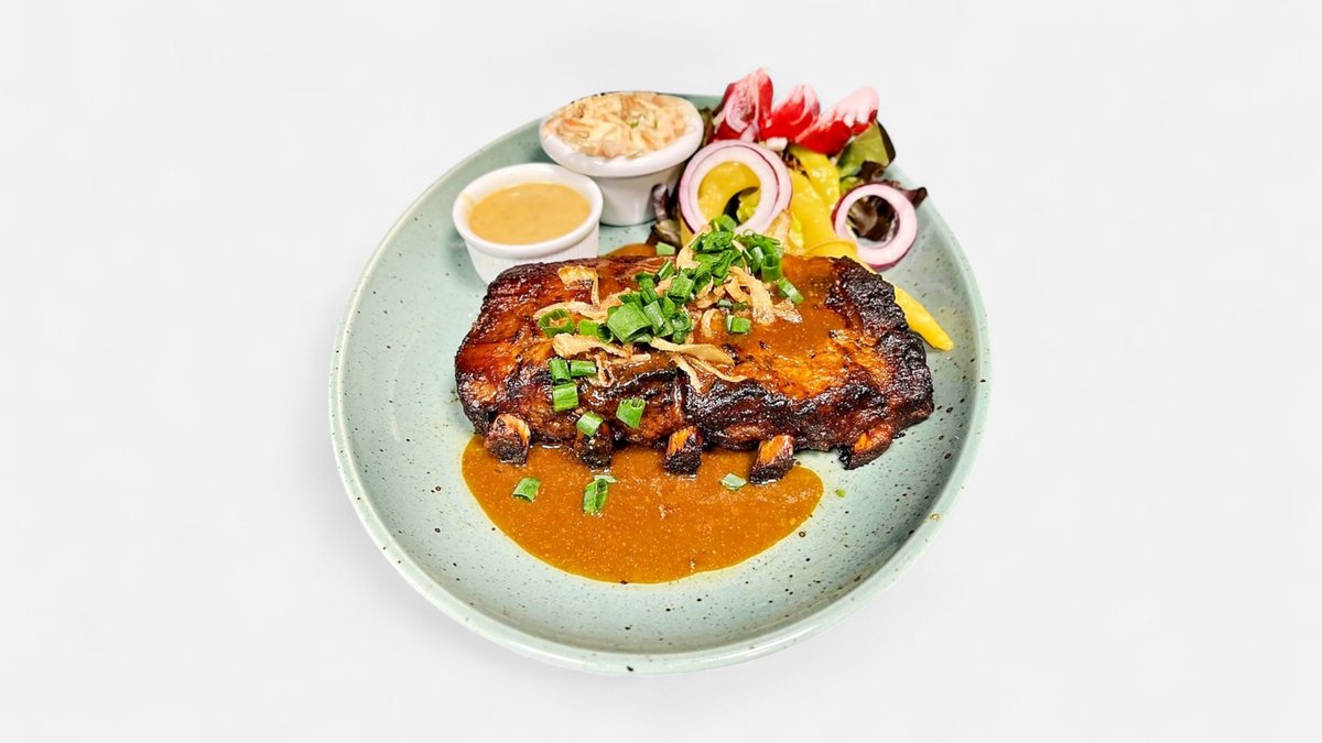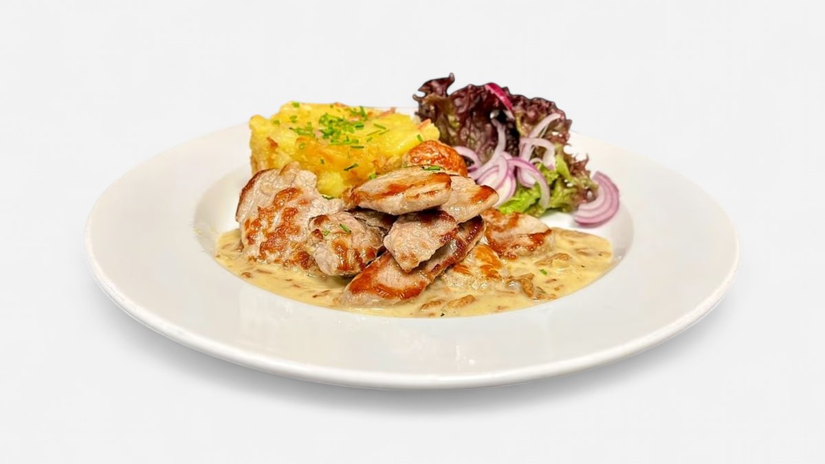 150g Vepřový steak marinovaný v česneku, hořčičná omáčka, šťouchané brambory, zelný salátek (A1a,7,9,10,12)