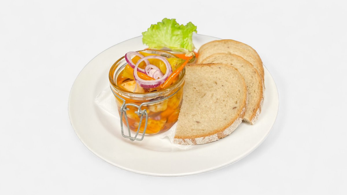 Nakládaný utopenec s cibulí, paprikou a beraním rohem, chléb