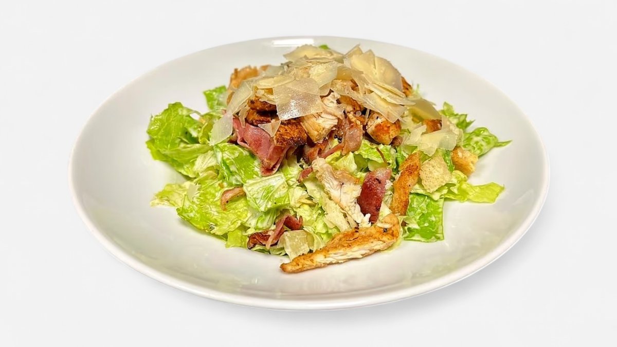 Caesar salát s kuřecím prsíčkem, slaninovými chipsy, parmazánem a bylinkové krutonky