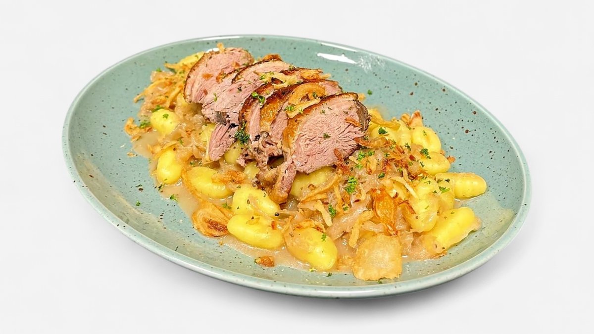 200g Pečený bůček na česneku, jalovci a pivu, bramborové noky s kysaným zelím a cibulkou (A1a,3,7,9,10,12)