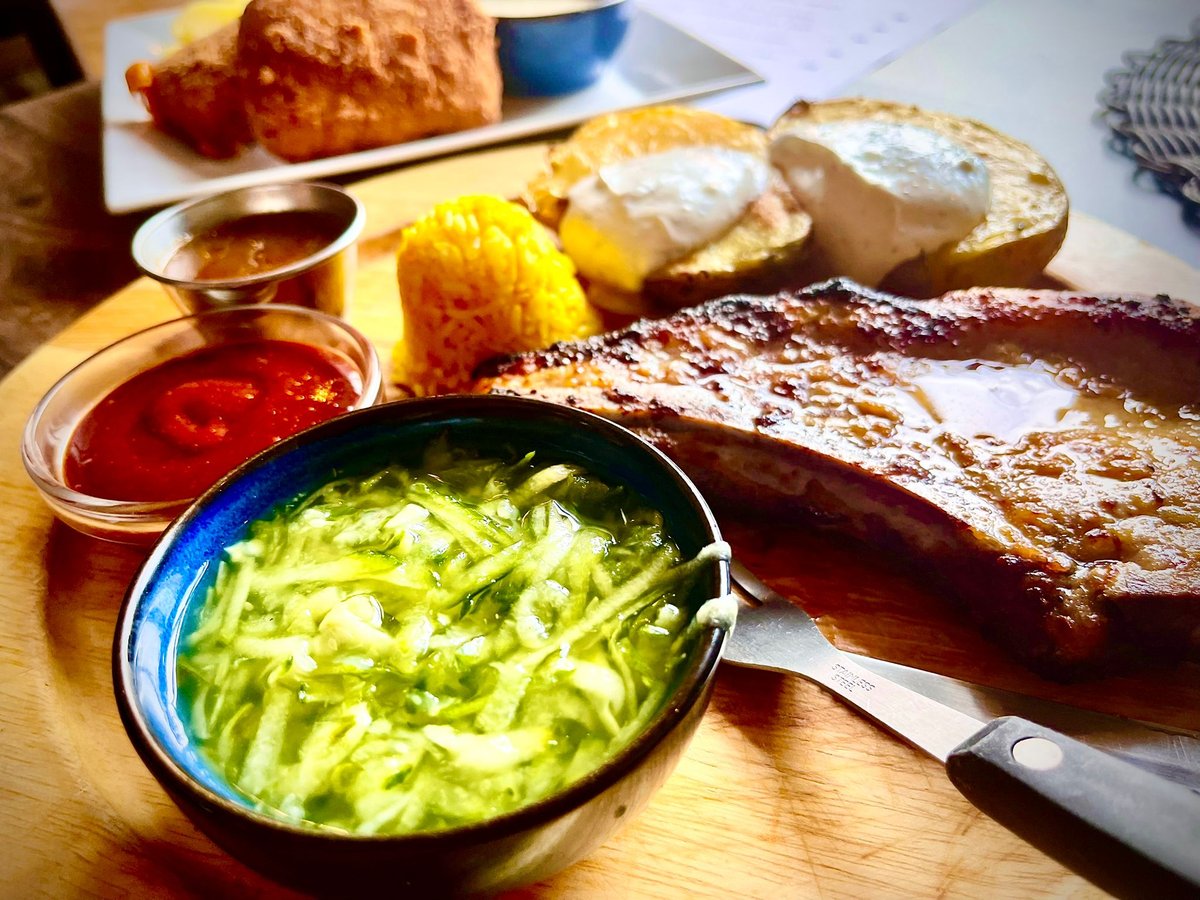 Grilovaný vepřový steak s kostí, podávaný s pečeným bramborem a BBQ omáčkou. Alergeny: 7, 10