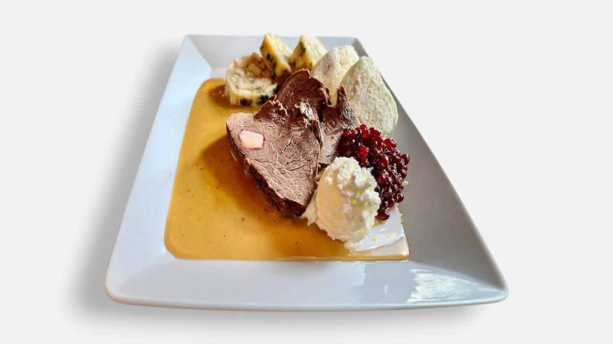 Hovězí svíčková na kořenové zelenině se smetanovou omáčkou, podávaná s houskovým knedlíkem. Alergeny: 1 (lepek), 7 (mléko)