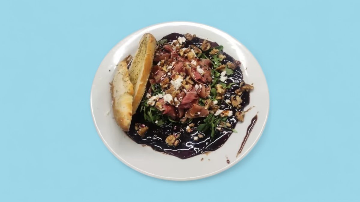 kozí sýr, ořechy, rukola, parmská šunka, bagetka, balzamiková redukce