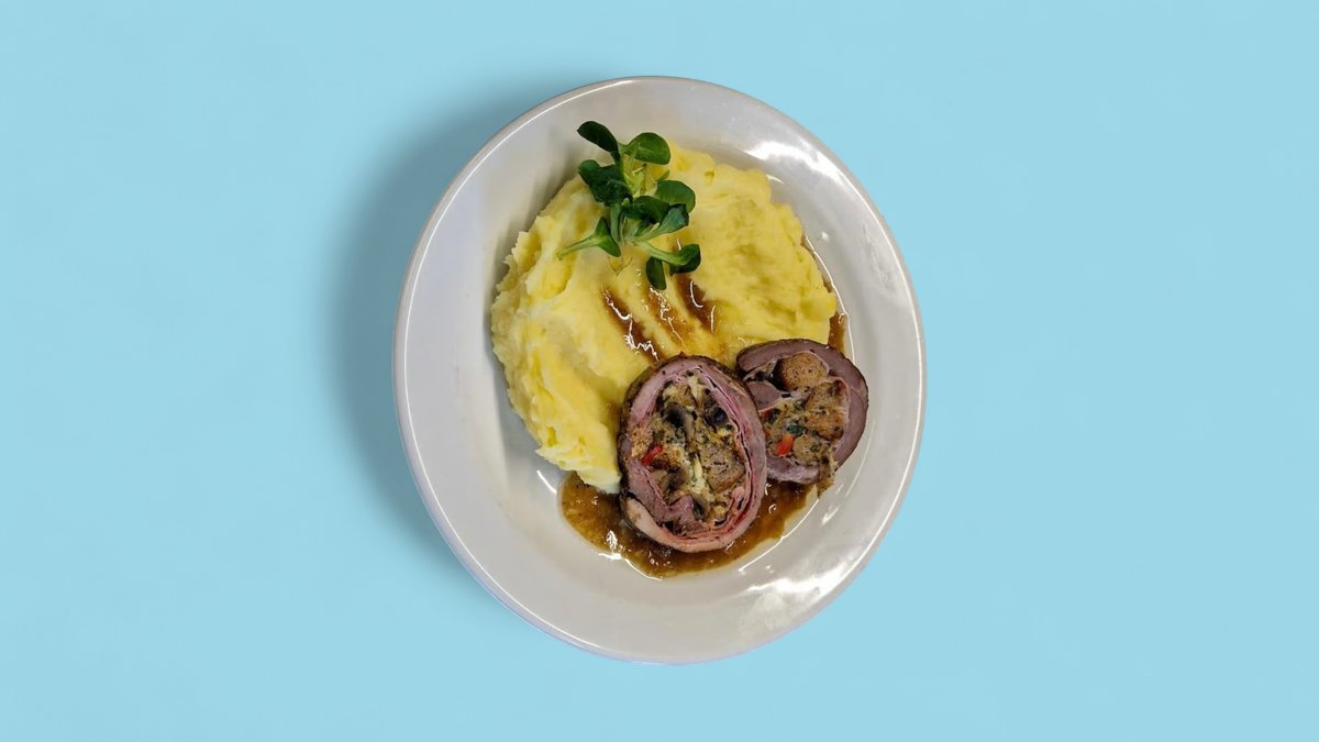 M1)1,3,7,9 200g Vepřová roláda s nádivkou, bramborová kaše, salát Coleslaw