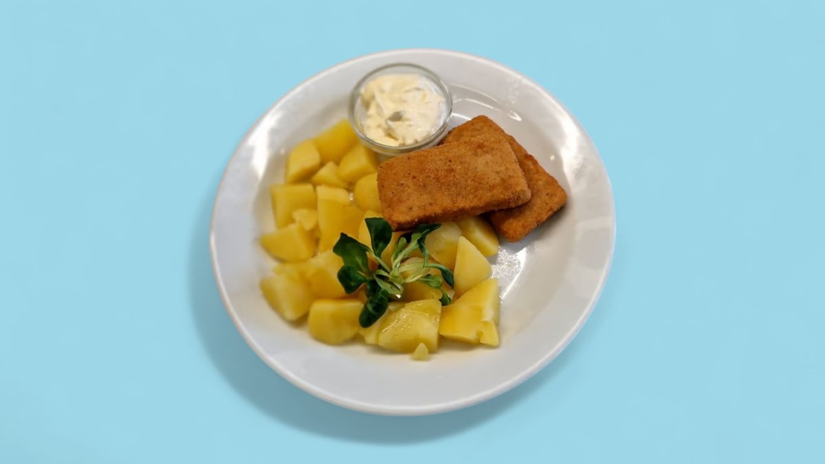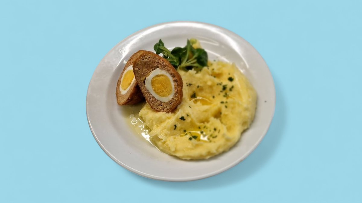 M7)1,3,7,9 150g Smažené pštrosí vejce, bramborová kaše, okurkový salátek