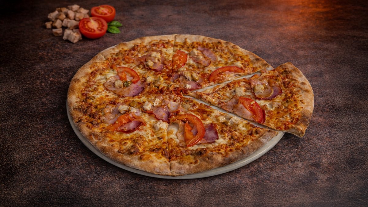 Tomato, mozzarella, slanina, salám, kuřecí maso, olivy Tomatoes, mozzarella, bacon, salami, chicken meat, olives