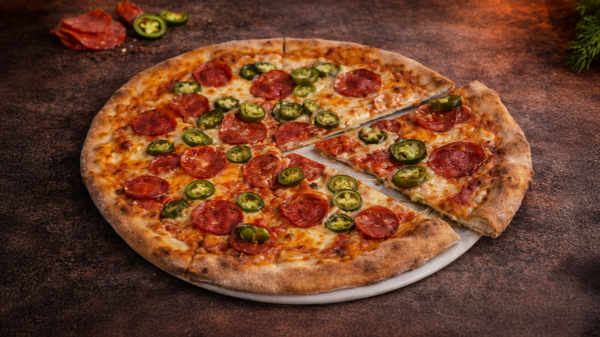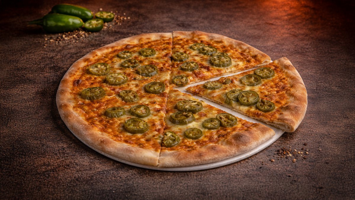 Tomato, mozzarella, pikantní salám, Jalapeňos Tomatoes, mozzarella, spicy salami, Jalapeňo
