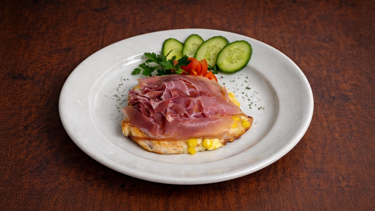Královský kuřecí steak zapečený s kukuřicí, sýrem a šunkou 250g Royal chicken steak baked with corn, cheese and ham 250g